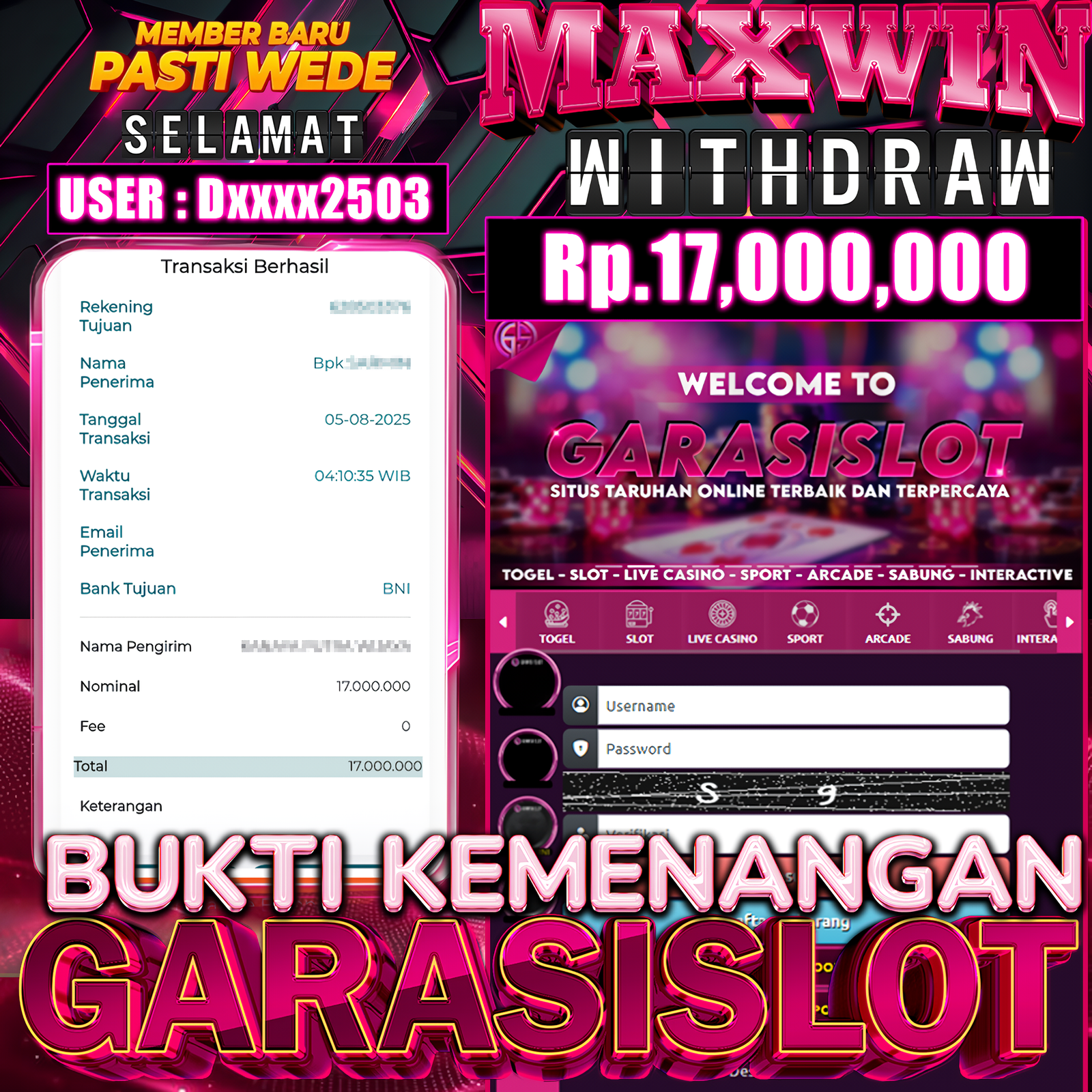 Selamat Kepada Id : dxxxx2503 Atas Withdraw Rp. 17.000.000 Juta Hari ini. Ditunggu Withdraw Selanjutnya dan ajak juga teman temannya bergabung di GARASISLOT GARASISLOT adalah situs game