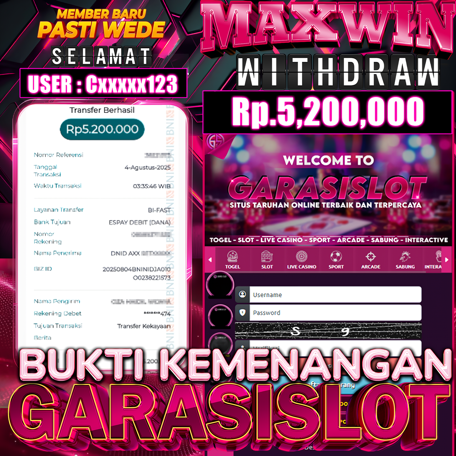 Selamat Kepada Id : Cxxxx123 Atas Withdraw Rp.5,200.000 Juta Hari ini. Ditunggu Withdraw Selanjutnya dan ajak juga teman temannya bergabung di GARASISLOTGARASISLOT Bukti Kemenangan Slot Sugar