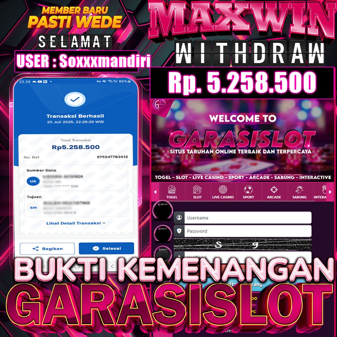 Selamat Kepada ID : soxxxmandiri Atas Withdraw Rp. 5.258,500 Juta Hari ini. Ditunggu Withdraw Selanjutnya dan ajak juga teman temannya bergabung di GARASISLOT Rumah ny