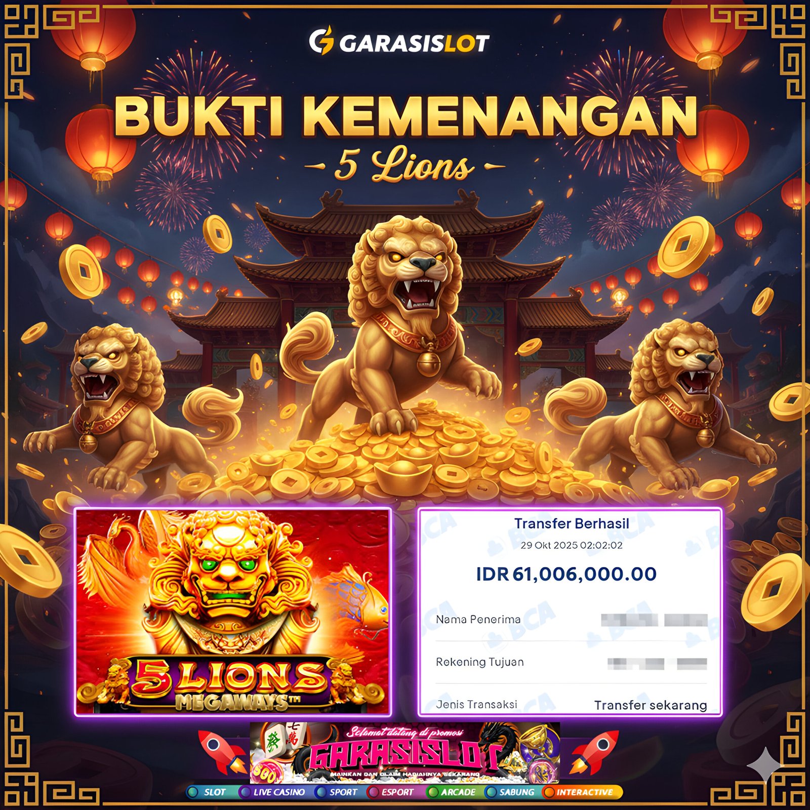 Keberuntungan kembali menggema di GARASISLOT, kali ini datang dari game slot legendaris bertema Asia — 5 Lions Megaways! Dengan simbol naga, singa emas, dan mutiara