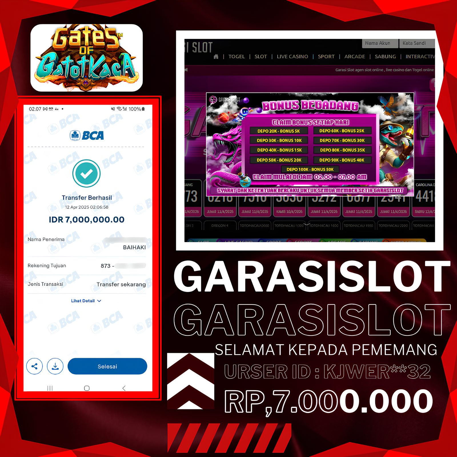 Selamat atas kemenangan user ID: kjwer**32 yang telah berhasil mendapatkan jackpot di permainan Pramatic dengan kemenangan besar RP 7.000.000,-. Setelah berhasil isi form withdraw team GARASISLOT langsung proses hanya 2-3 menit untuk transfer kemenangan team kita selalu yang terbaik.