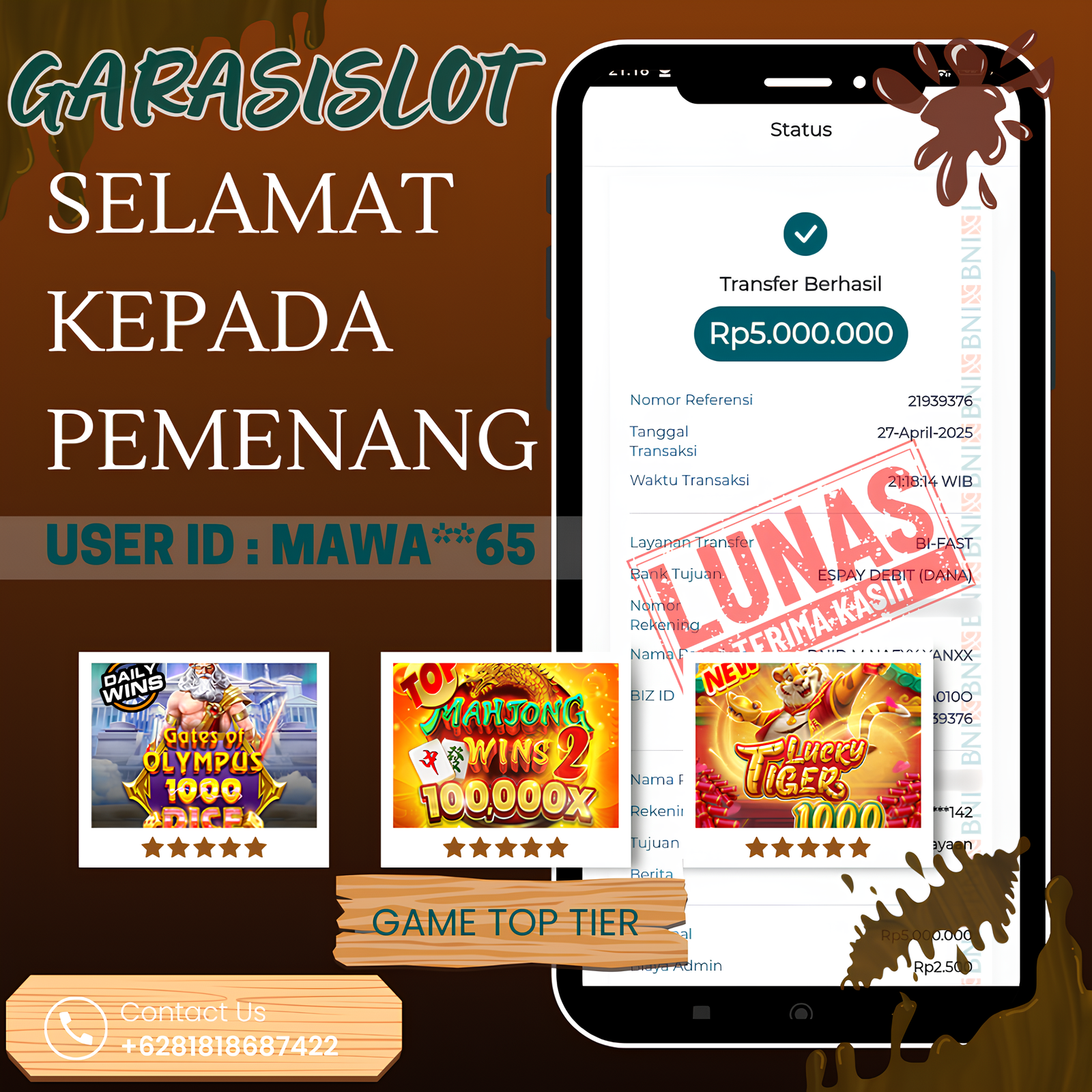 Selamat atas kemenangan user ID: mawa**65 yang telah berhasil mendapatkan jackpot di permainan Pg soft dengan kemenangan besar RP 5.000.000,-. Setelah berhasil isi form withdraw team GARASISLOT langsung proses hanya 2-3 menit untuk transfer kemenangan team kita selalu yang terbaik.