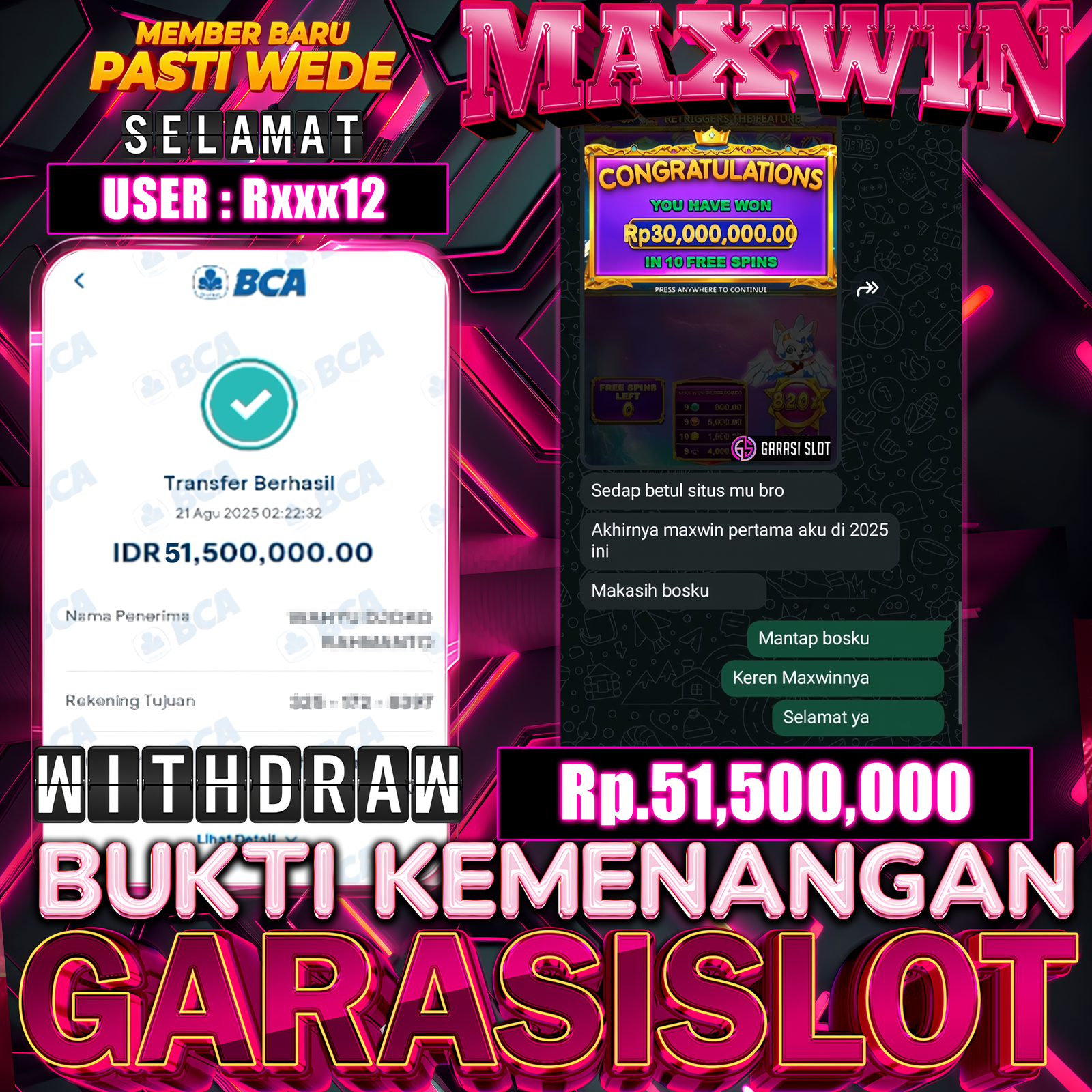 Selamat Kepada Id : RXXX12 Atas Withdraw Rp. 51.500.000 Juta Hari ini. Ditunggu Withdraw Selanjutnya dan ajak juga teman temannya bergabung di GARASISLOT